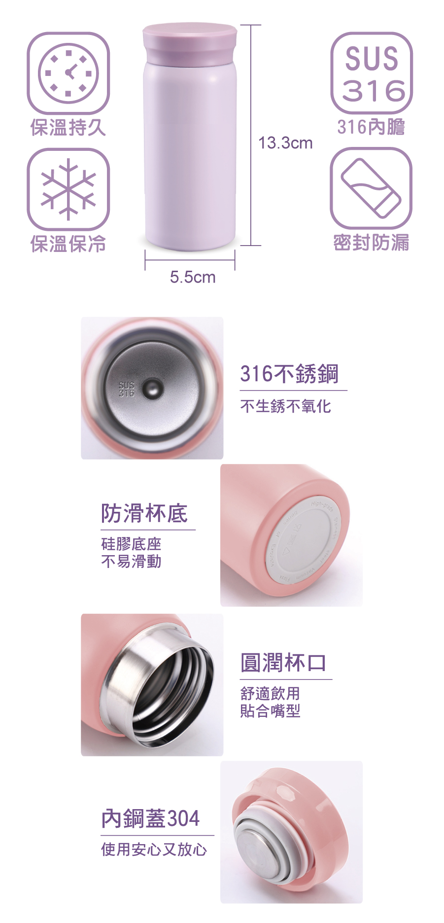 規格:本體約直徑5.5x高13.5cm,220ml,?膽316不銹鋼材質,混色出貨 包裝:盒裝 加工方式:外盒貼貼紙 基本量: 歡迎來電洽詢 【商品說明】 歡迎來電洽詢 【推薦商品】 bt00 彩色布條(280x150cm) bt00-1 彩色布條(240x45cm) bt00-2 彩色布條(180x60cm) bt00-3 彩色布條(240x75cm)