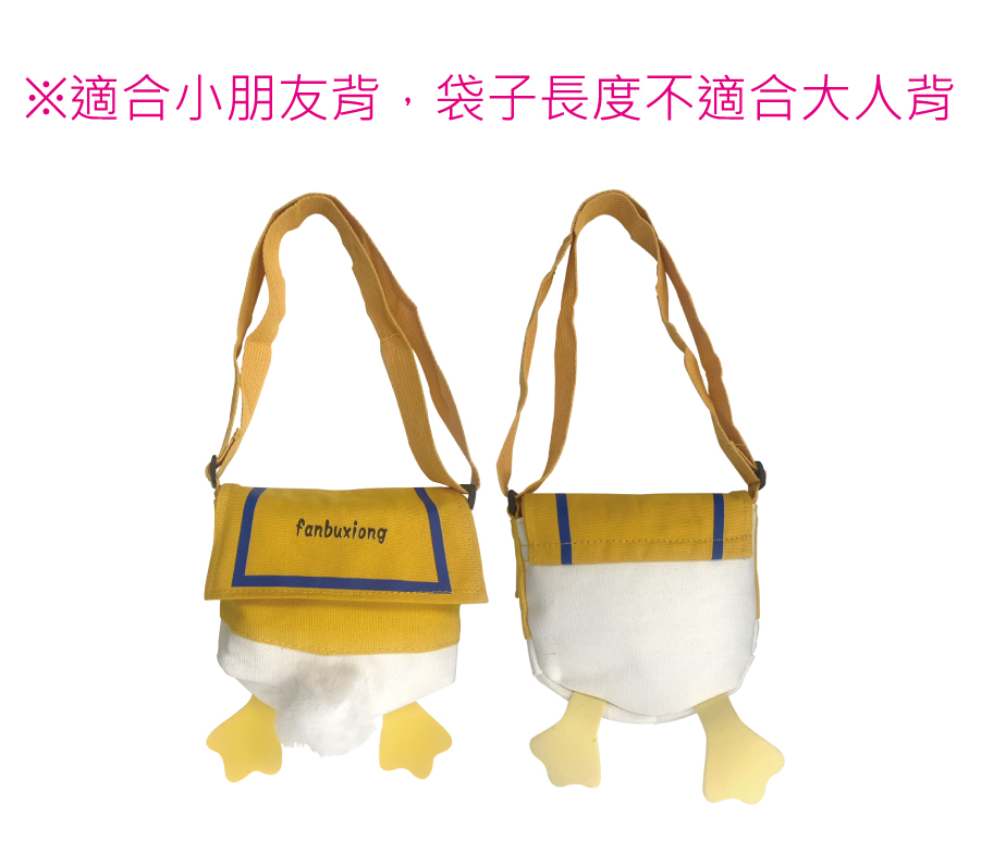 規格:本體約19x17.5cm(不含背帶、鴨子腳長度),背帶拉到最長約45.5cm 包裝:PP袋 加工方式:外袋貼貼紙 基本量: 歡迎來電洽詢 【商品說明】 歡迎來電洽詢 【推薦商品】 bt00 彩色布條(280x150cm) bt00-1 彩色布條(240x45cm) bt00-2 彩色布條(180x60cm) bt00-3 彩色布條(240x75cm)